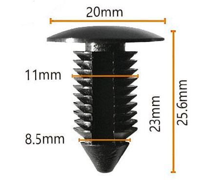 La lunghezza totale del dispositivo di fissaggio è di 25,6 mm, la larghezza è di 20 mm e l'altezza della testa è di 11 mm.