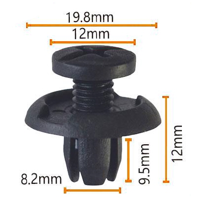 Misurando precisamente 19,8 mm di lunghezza, 12 mm di larghezza, 9,5 mm di altezza e 8,2 mm di spessore, questo dispositivo di fissaggio è conforme agli standard del settore, garantendo un adattamento senza soluzione di continuità con varie parti automobilistiche. Realizzato in plastica nera di alto grado, vanta una costruzione leggera, resistenza alla corrosione e resistenza all'usura, migliorando la sua longevità.